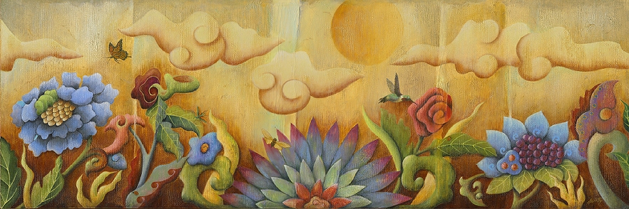 for this painting of an imaginary Tibetan, garden oasis.